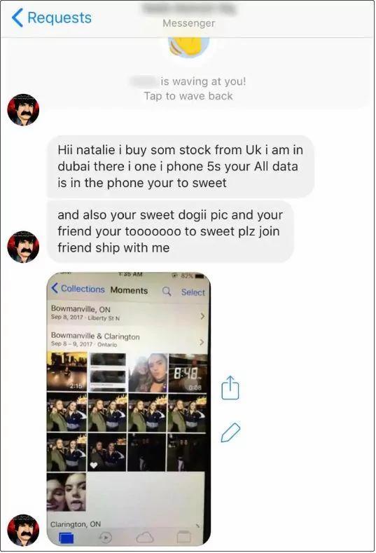 Hall居住在安省Bowmanville,她說到:“我真是嚇壞了,一位陌生男子他手裡有你的聯繫方式,你的社交帳號,你的信息和照片所有關於你的一切, 這感覺真是讓人毛骨悚然 。 ”