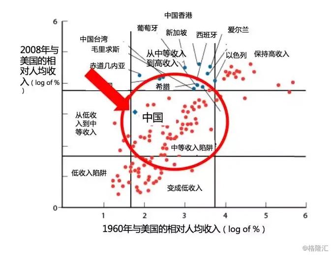 現在講第二個,中國。 中國在這張圖的什麼位置? 中國就是在這個“中等陷阱”裡面。