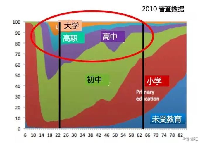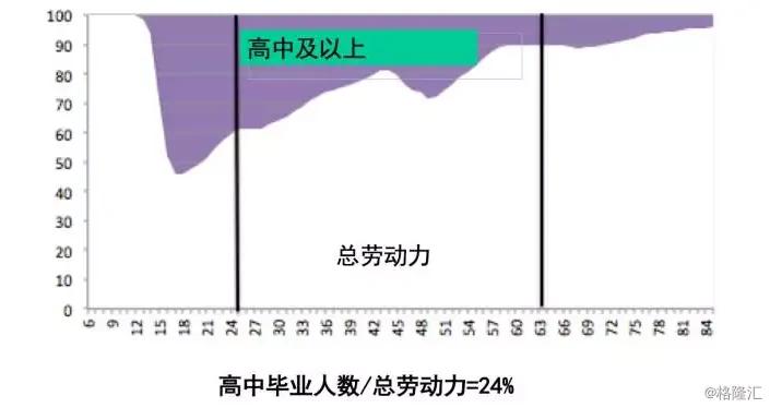 上過高中和高中以上的人口占24%—— 4個中國勞動力裡面只有1個上過高中 。