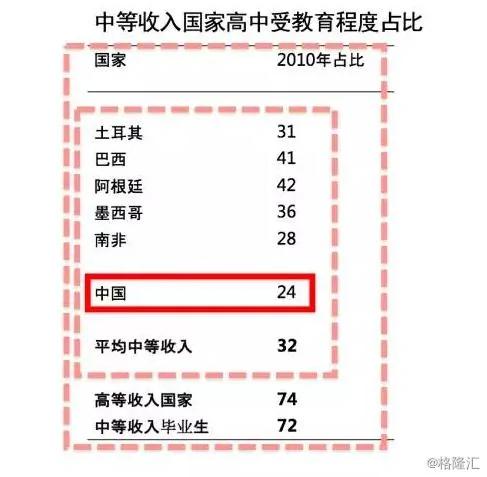實際上, 跟別的國家比,在所有中等收入(的國家)裡面,中國的教育,中國的人力資本是最低的。 這個不是我算出來的,是2010年人口普查的結果。