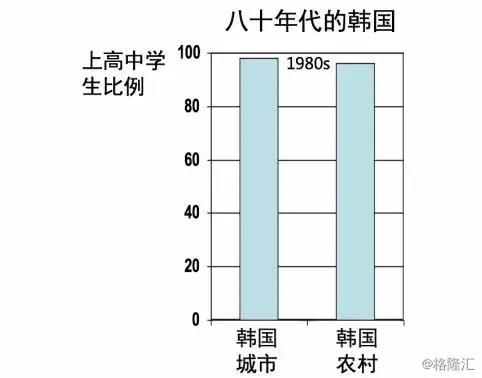 但是你看,早在80年代的韓國,就有將近100%的農村孩子上高中,幾乎每一個孩子都上高中。