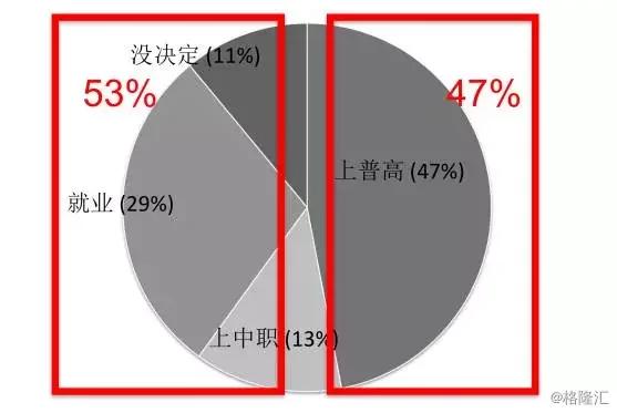 一半的孩子——47%的孩子,說我想上高中;然後一半的孩子說,職高,或者直接去工作——這在中國是允許的,初中畢業就可以直接去工作。 最後還有一些說沒想好。