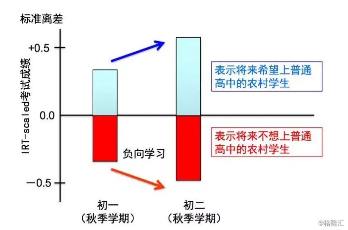 我們就根據他們想不想上高中,把他們分為兩類,給他們做一個考試,這個考試很特別,叫IRT-scaled測試,用於測試學習到的絕對知識。 學年頭尾做兩次這樣的考試,我們就能測出來這些學生到底今年有沒有學習到新的知識。