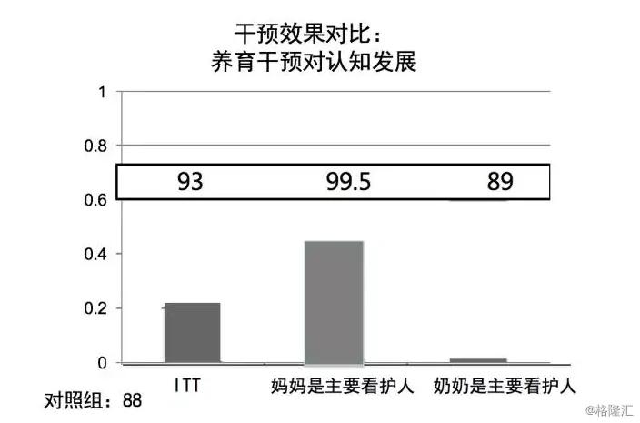 看看這個圖,首先,沒有乾預的對照組,孩子平均IQ是88,53%的孩子IQ低於90,智力發展緩慢。 但是我們教了6個月,上26次課,如果媽媽在家,孩子的認知發展完全正常。
